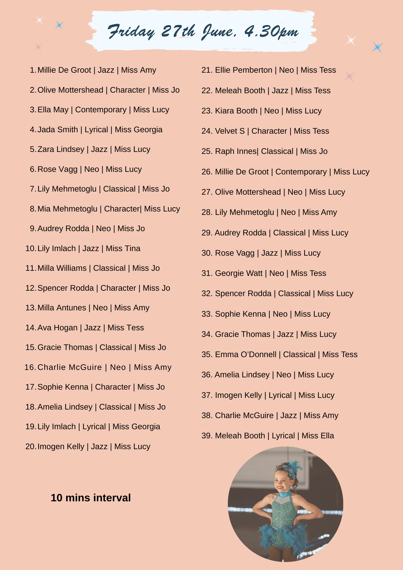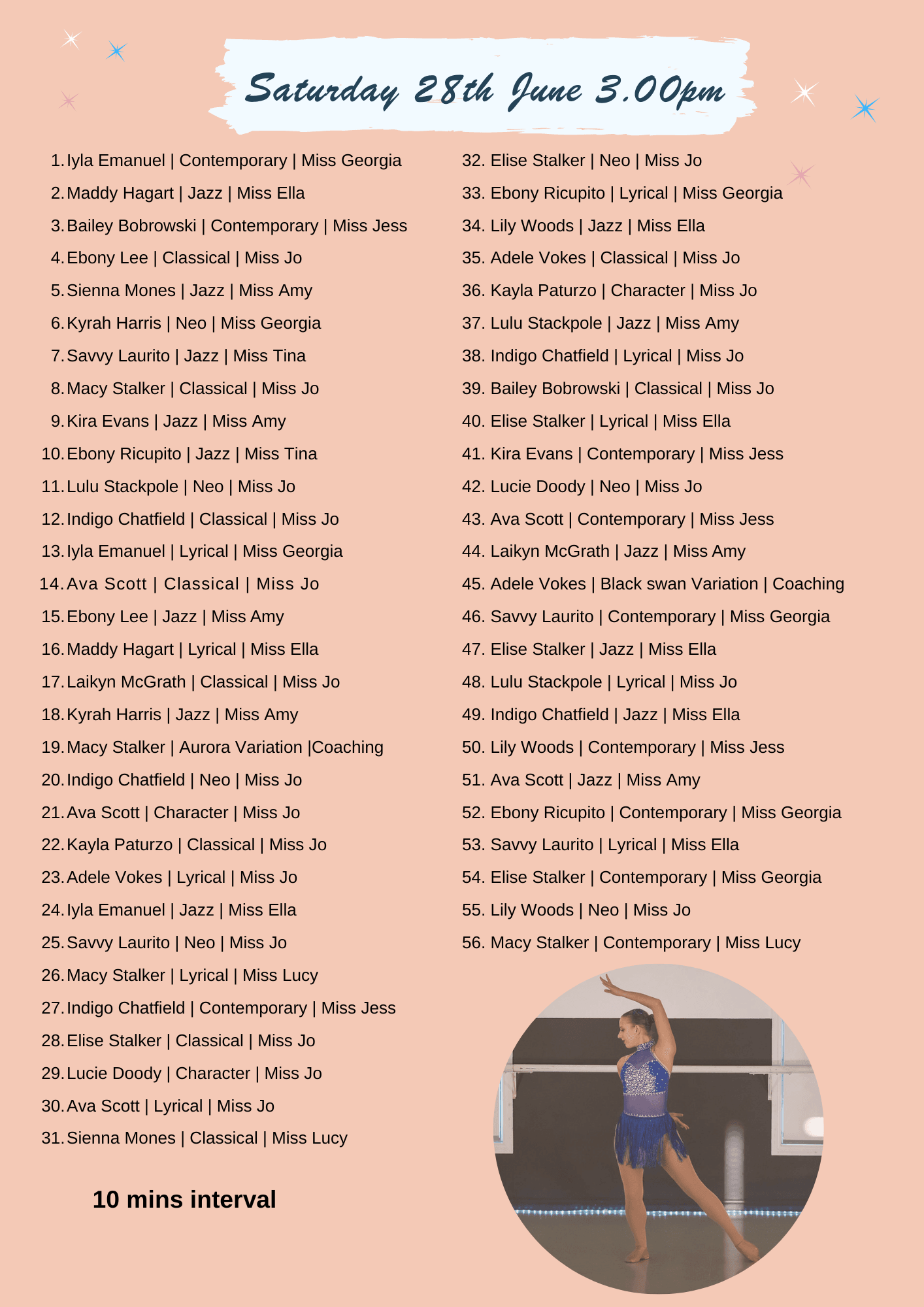 The event program is below so please take a moment to review it. This will help you plan your time to allow for warm-up, costume changes, and performing to the best of your ability.