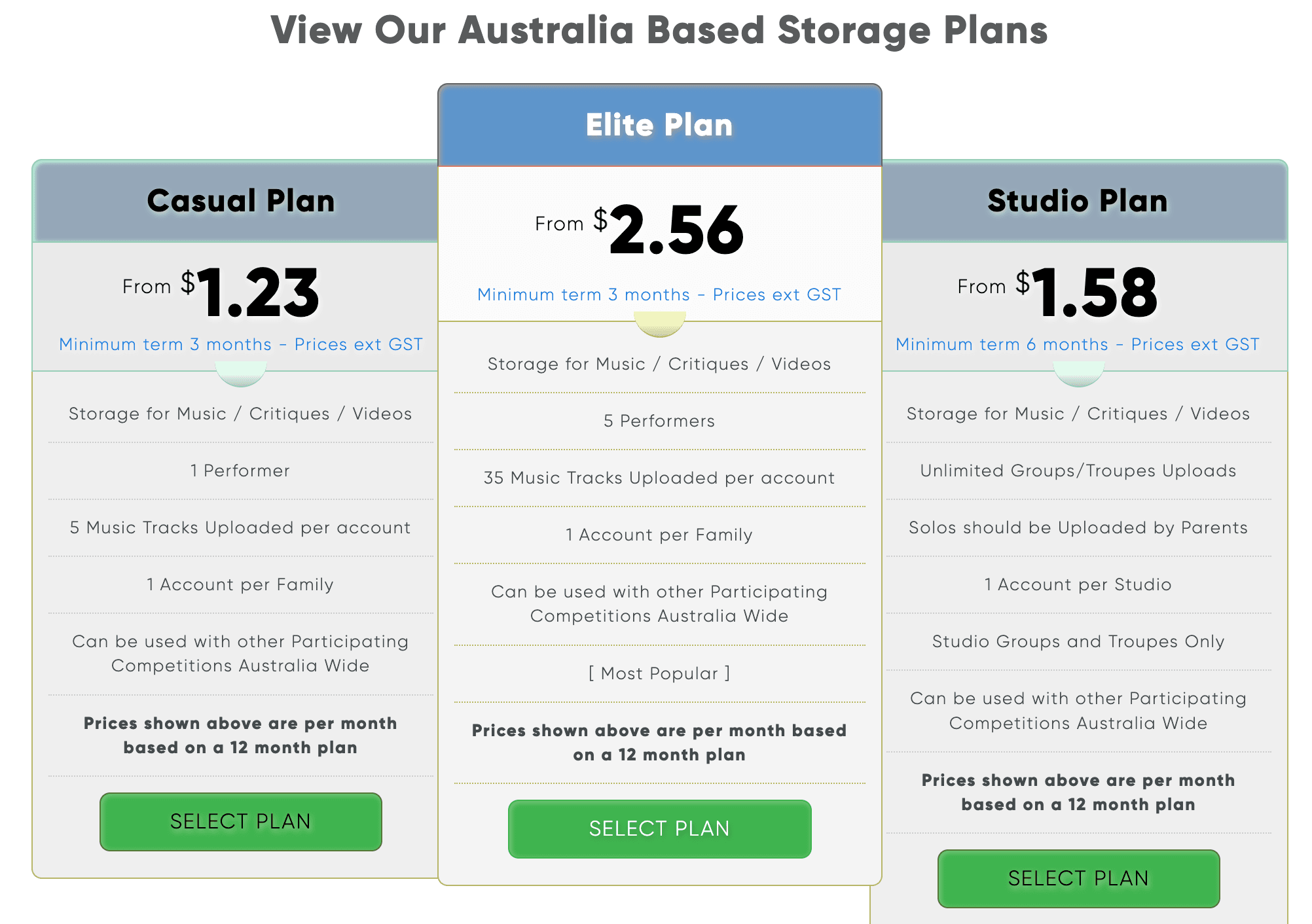 Step 2: Choose your 3 month plan. Most families will only need the Casual Plan as this gives you access for 1 performer and up to 5 tracks to upload. Any students doing more than 5 solos or families with more than 1 dancer will need the Elite Plan.